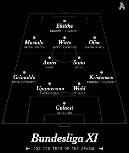直播吧5月21日讯 2024-25赛季的德甲已经落下帷幕,《Theanthletic》评选出了赛季最佳阵,穆西亚拉、维尔茨、奥利塞入选,于帕梅卡诺、佐野海舟在列。